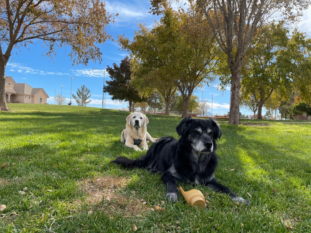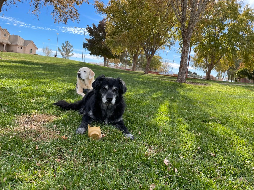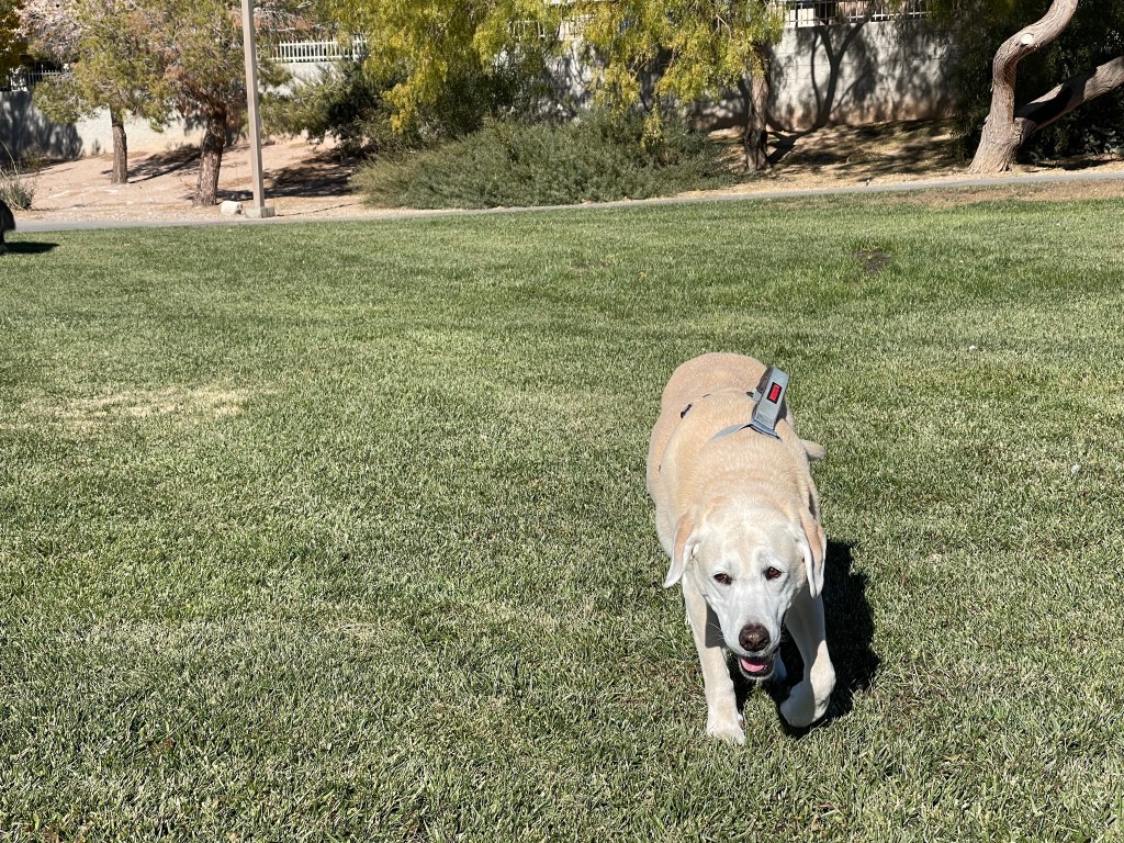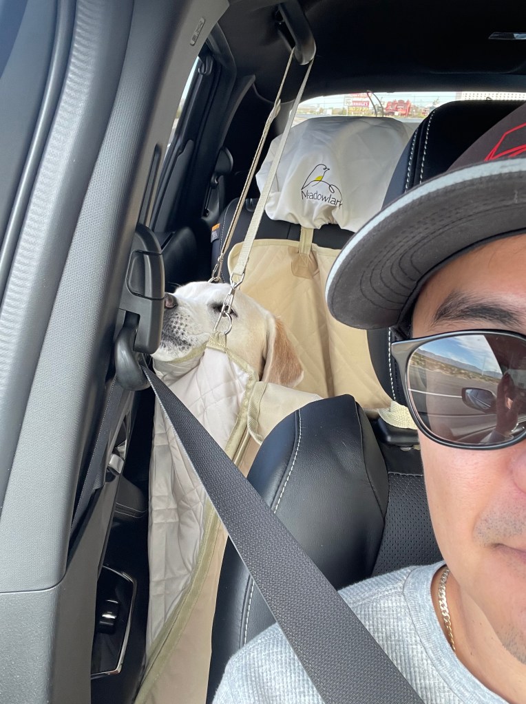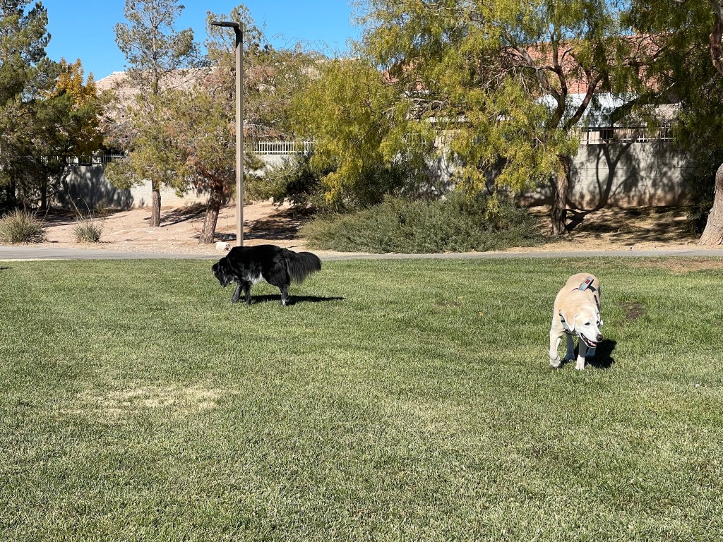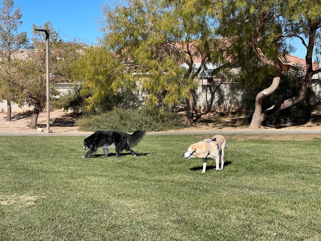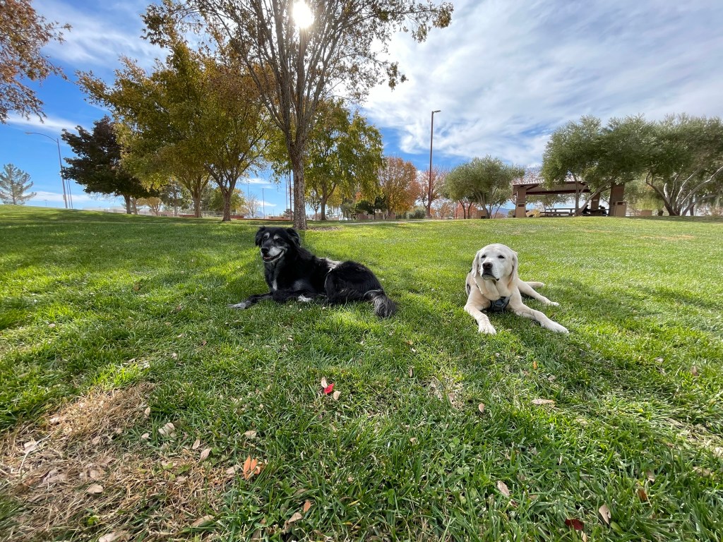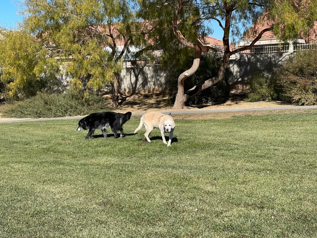 Moby reunited with old friend Billy in Henderson, NV. Travel by car can be tiring. Lots of rests at rest areas along the way. Lots of new smells and treats throughout.